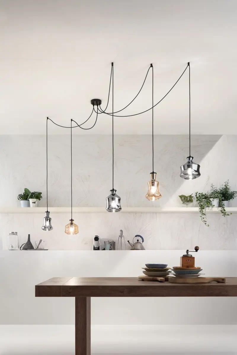 Hai il punto luce nel posto sbagliato e il tetto è troppo inclinato? Usa le sospensioni a ragno (spider). Permettono di portare il cavo in tessuto ovunque, fissandolo con dei piccoli nottolini. In una mansarda moderna, vedere il disegno dei cavi che seguono le pendenze aggiunge un tocco industrial estremamente ricercato.